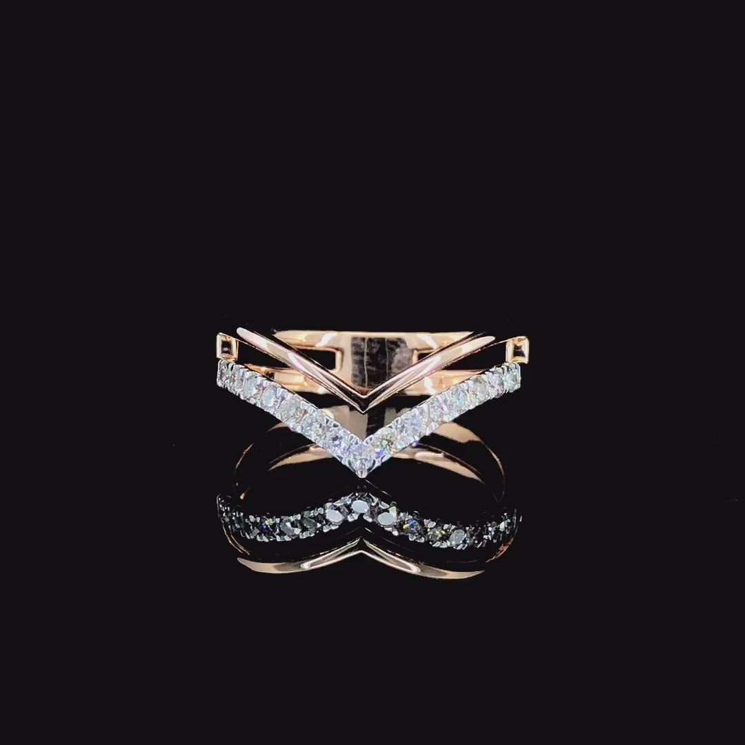 Each moissanite diamond is D Color, VVS Clarity, precision-cut to Ideal/Excellent standards for maximum fire and brilliance. The clean chevron design sits beautifully on the finger, making it perfect to wear alone or stacked with engagement and wedding rings.