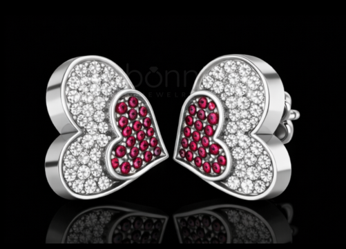 Fall in love at first sparkle with these Double Heart Lab-Grown Diamond Stud Earrings, a romantic expression of modern luxury. Two beautifully layered heart shapes come together—one shimmering with brilliant white lab-grown diamonds, the other glowing with rich ruby-tone accents—symbolizing passion, connection, and forever love.