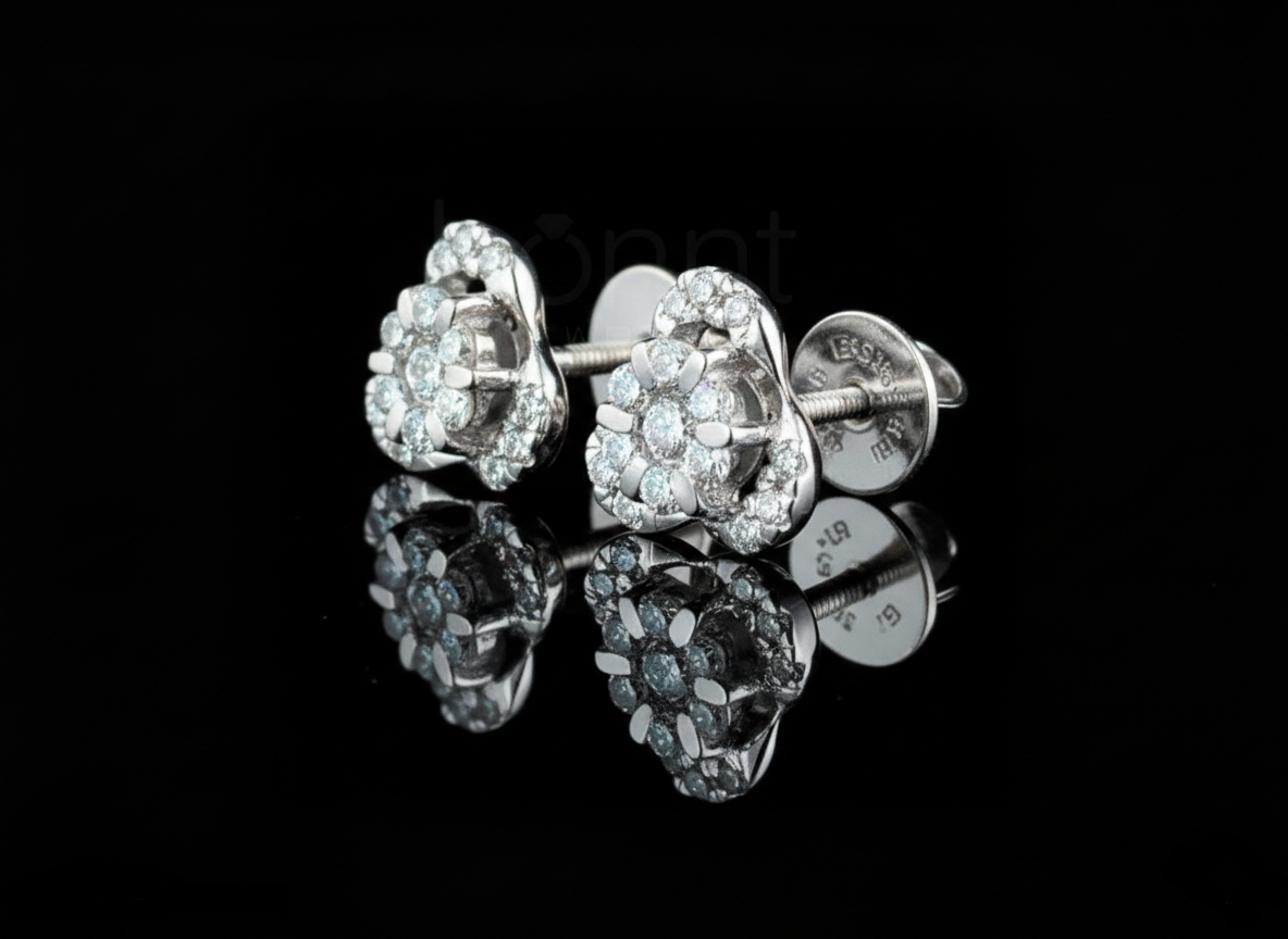 Crafted with EF color diamonds for icy white brilliance and VVS–VS clarity for exceptional purity, every stone is finished with an Ideal / Excellent cut to maximize fire and shine. Set securely to sit perfectly on the ear, these earrings offer luxury you can see and comfort you can feel—every single day.